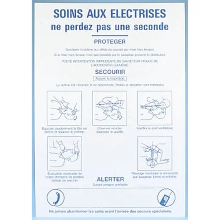 Care instructions for persons injured by electricity. Notice panel with clear and durable information displaying care instructions for persons injured by electricity. This notice is compulsory inside business premises since 01.01.1993 and this notice panel is fully compliant with the standards in force. A space is reserved for telephone numbers or job positions to be alerted. Made from rigid polypropylene, highly resistant, particularly to UV rays. Size 500 x 350 mm.