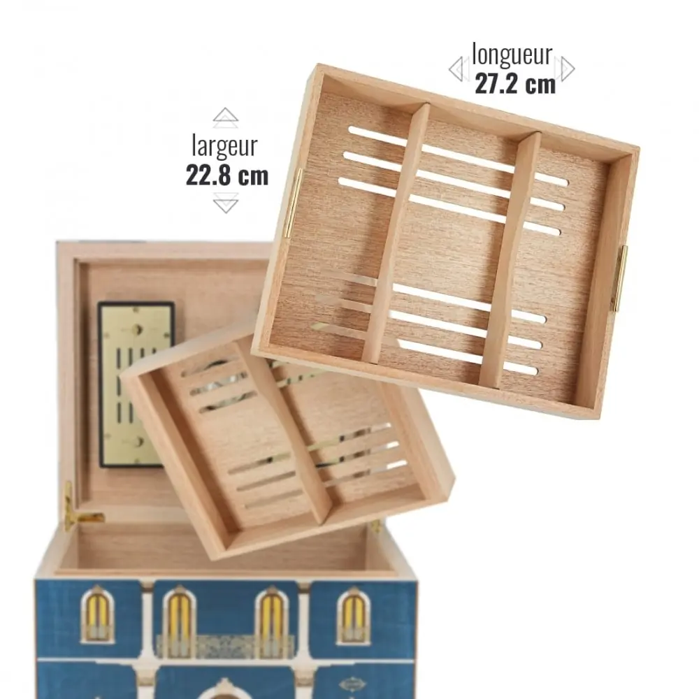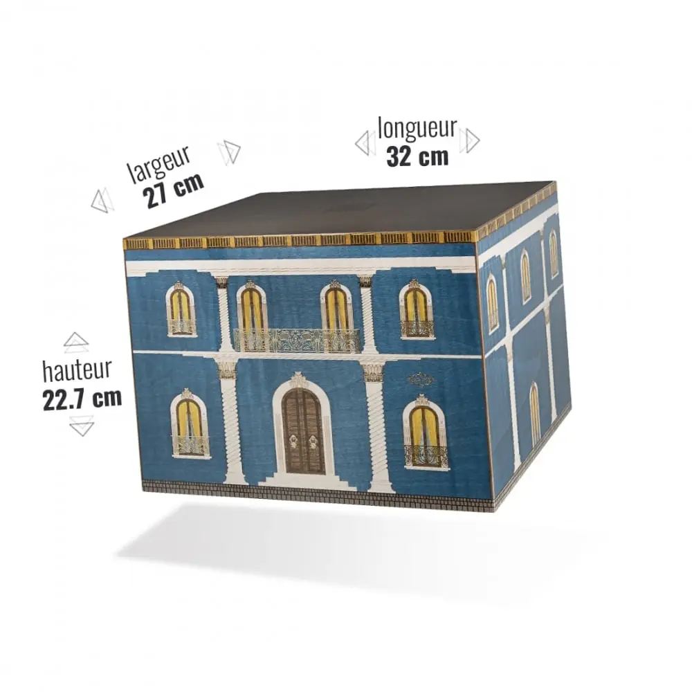 the french house offers here a magnificent box made up of 12 types of wood with marquetry on the outside taking up the features and colors of 19th century cuban houses with metal balconies. the interior is made of cedar wood and is divided into 3 storage levels. a needle hygrometer and two humidifiers are included. limited edition.