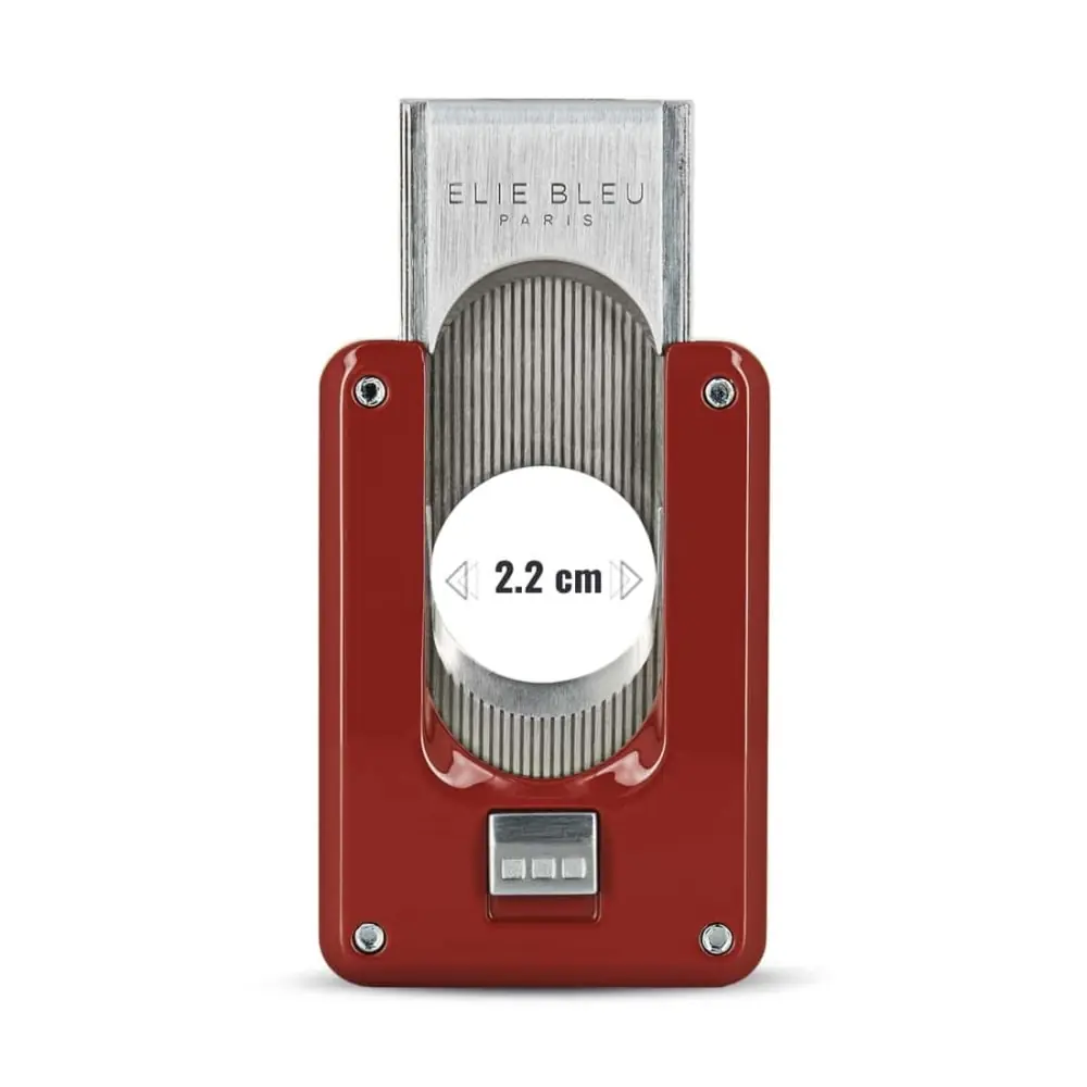 Elie Bleu luxury cigar cutter with metal body and surgical stainless steel blades guaranteeing a long life. This cigar cutter is in UV-resistant red lacquer. It offers a wide cutting opening (2.2 cm) with an automatic opening system.