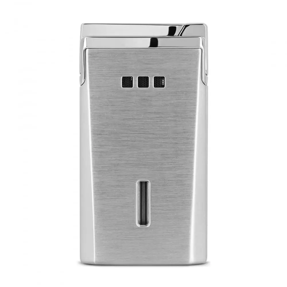 Thin cigar lighter with only 13 mm thickness. With a powerful torch flame and gas refillable. Brushed metal color with chrome ignition button.
