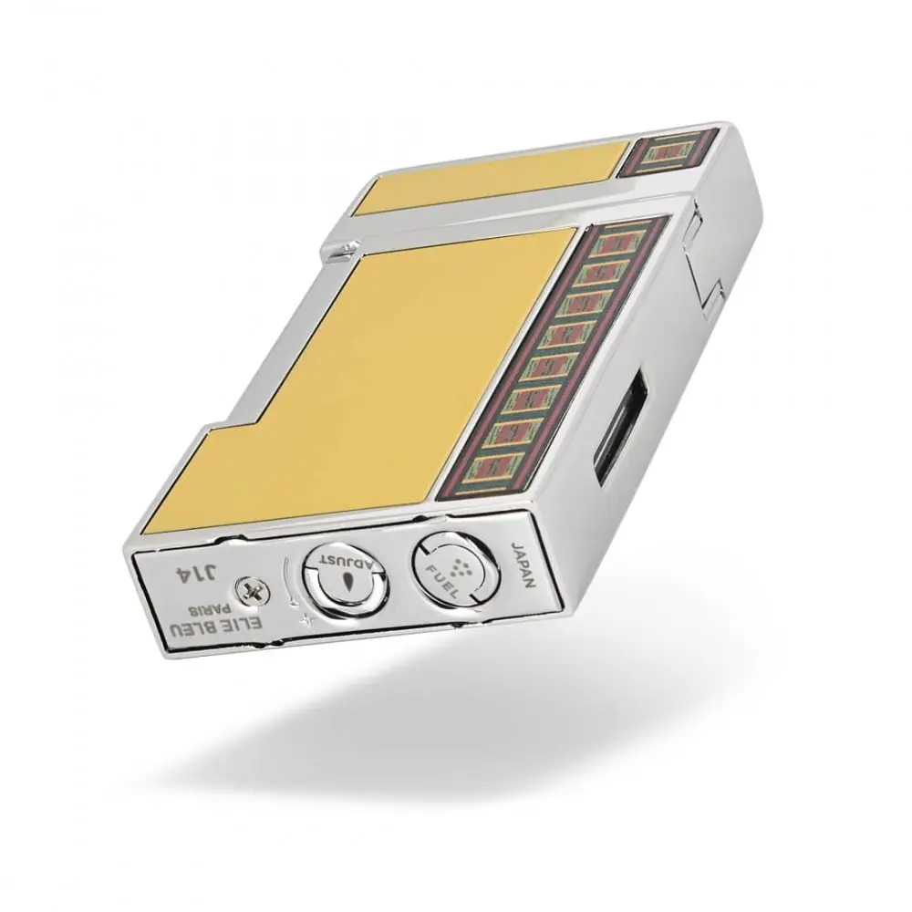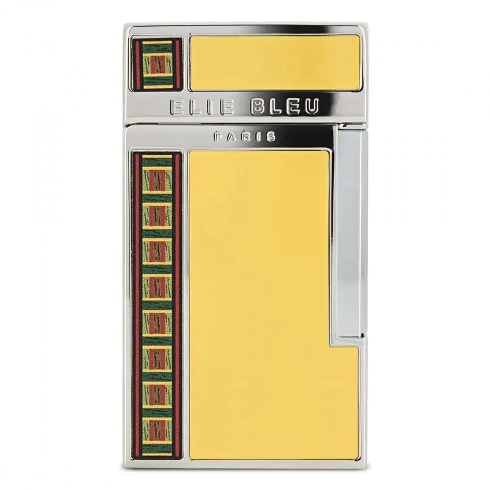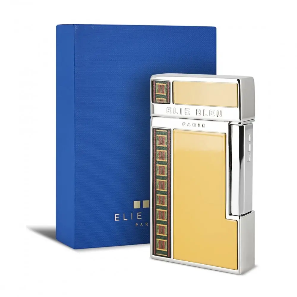 Luxury metal cigar lighter with electronic ignition. The Elie Bleu Diamond Alba Yellow cigar lighter is a lighter harmoniously decorated with "Alba" marquetry on yellow lacquer and a chrome ignition button. It is obviously rechargeable with gas (for sale on our site) and offers a powerful torch flame allowing you to light a cigar in no time. It has a gas level window and the intensity of the flame is very easily adjustable via a small wheel located under the lighter.