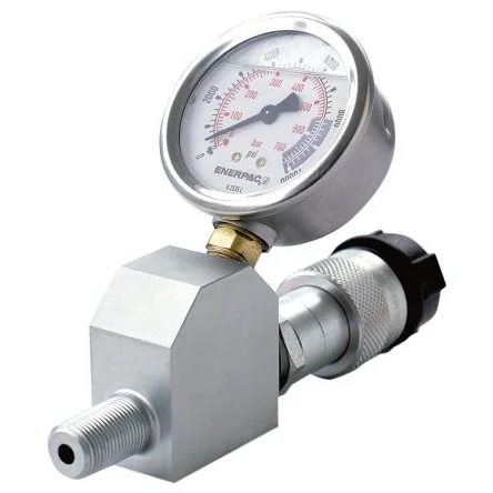 Gauge Adapter Assembly. Pressure gauge adaptor assembly fitted with a 0-700 bar 70mm pressure gauge, mounted at 45 degree for easier viewing and a 700 bar high flow coupler (CR-400) with 35 l/min flow capacity. When used in conjunction with ENERPAC ‘s pumps and lifting cylinders provides an easy way to check pressure during operation. 45° angled gauge improves visibility Slim and narrow design Easy to fit in a broad range of systems Maximize controlled load movement Glycerin dampened gauge with dual scale Enerpac High Flow female coupler.
