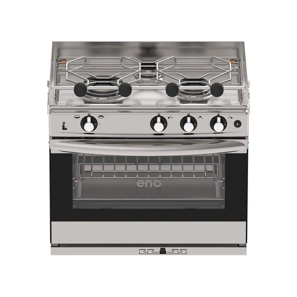The Grand Large 3 Burner Cooker with Oven by ENO is a marine gas cooker designed for boat kitchens, offering a combination of three powerful burners and a spacious oven. Crafted entirely from stainless steel with a polished finish, this cooker ensures durability and resistance to the marine environment. It features an enameled oven with a 24-liter capacity, providing ample space for baking and roasting. The oven is equipped with a manual temperature control and includes a baking tray and roasting rack. Safety is prioritized with a thermocouple device, electronic ignition powered by a 1.5V battery, and a flame guard. The cooker comes with two pairs of pot holders and gimbals, allowing for secure cooking even when the boat is tilting. Installation requires a gas supply regulated to 30 mbar, compatible with butane and propane gases. The cooker is CE certified and includes a two-year warranty.