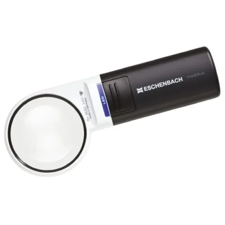 Eschenbach Mobilux Illuminated Pocket Magnifiers. The tried and tested illuminated hand-held magnifiers now feature a new design and improved functions. Manufactured in Nuremberg Germany, the mobilux LED illuminated magnifiers are ideal for reading small print both in the office and when you ‘re on the move, e.g. when you ‘re searching for telephone numbers or looking at spreadsheets. They incorporate a large, easy to use light switch that operates a choice of 2 different colour of light through the use of the supplied filter. The included AA batteries are easy to change and the magnifier has a handy eyelet on the end of the handle for round-the-neck-cord. A case is provided to protect the aspheric lens. Battery cover is easy to open and contact springs clearly indicate the battery position Improved comfort due to eyelet for round-the-neck cord Filter enables you to choose the ideal colour of light The LED light used by Eschenbach has a service life of approx. 50,000 hours The battery life is up to 10x longer in comparison to a conventional light The voltage is controlled via a step-up converter, which produces a brighter and even illumination CERA-TEC coated lenses