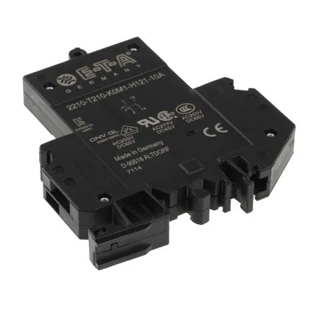UL, CSA, VDE, BV, LRoS. For Precision Applications, 2210 Series. Overload and short circuit protecting, DIN rail mounting, time delay type thermal-magnetic single-pole CBE, suitable for process control, telecom and other professional/precision applications, etc. Toggle operated trip-free mechanism Auxiliary contact (NC) for remote signalling of contact breaker status Narrow profile enables high density packaging Compatible with Top-hat and G-profile DIN-rail Compatible with modular DIN 43880 housings IEC Classification S/TM 20 - 30 second tripping time Typical life - 5000 Ops.