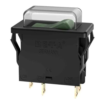UL; CSA; VDE (EN 60934); CCC. 3120-F Thermal Circuit Breaker Rocker Switch. Combination circuit breaker / On-Off switch with rocker actuation Snap-in panel front mounting Trip-free, snap action mechanism Two-pole, Single-pole, thermally protected (port 11, 12k, 12i) On-off switch without current protection button Meets the CBE standard EN 60934 (IEC 60934) Meets the requirements of fire resistance according to EN 60335-1 Typical applications in electric motors, household appliances and office machines, electric tools, power supplies, rectifiers, medical devices according to EN 60601 Mounting hole 44.5 x 22 mm (clamping thickness 1-4 mm)