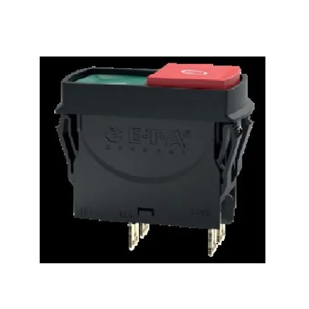 The ETA 3120-N 2-pole thermal circuit breaker/switch combination with push button actuation unites overcurrent protection and the function of an ON/OFF switch within a single component. It has blade terminals with flat head screws M3.5 for units with under voltage release module. The trip element is a thermal bimetal. After tripping, it can reliably, easily and quickly be reset. The positively trip-free mechanism ensures reliable disconnection of the circuit even with the actuator blocked. It is ideally suited for overload protection of motors, pumps, transformers and cables.Mounting type: Snap-in, cut-out 50.5 x 21.5mm Current rating: 15A Extendable functionality through appliance inlet module Power-on protection and water splash cover Reduced mounting and wiring time Space-saving design Reduced disposition and storage costs Increased overall reliability