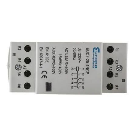 Modular contactors should be separated from other components using blanking modules to allow for heat dissipation. Europacomponents EUC2 Series Modular Contactor. Europa Components EUC2 series 4 pole modular contactors. These units are DIN Rail mounted and designed for installation in consumer units and three phase distribution boards. Ideal for heating lighting and building service type applications. 4 Pole Operating temperature: -5°C to 40°C 35mm DIN Rail mounting Maximum cable capacity main terminals: 10 mm² Maximum cable capacity coil terminals: 2.5 mm²