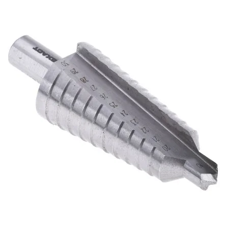 RS PRO High-Speed Steel (HSS) Step Drill Bit. RS PRO range of HSS step drill bits. These high-speed steel multi-diameter cutters require no pilot hole and are ideal for the rapid drilling of sheet metals and plastics. Their stepped cone shape allows for multiple diameter cutting surfaces on one drill. These drill bits can be used with power drills with a 13 mm chuck. Step Drill Bit Options:- ; 232-557 232-557 - 4 to 20 mm Drill Bit, 9 Steps ; 232-563 232-563 - 4 to 30 mm Drill Bit, 14 Steps ; 232-579 232-579 - 10 to 20 mm Drill Bit, 11 Steps ; 232-585 232-585 - 20 to 30 mm Drill Bit, 11 Steps ; 232-608 232-608 - 3 piece Drill Set 4 mm to 30 mm. Features and Benefits:. ;ul> ;li>HSS drill bits ;/li> ;li>Provides clear holes in applications requiring small hole size increments ;/li> ;li>No pilot hole required easily enlarges existing holes ;/li> ;li>Ideal for use with most power drills ;/li> ;/ul>. Application Information. Step drill bits are typically used in electrical, plumbing and HVAC applications. They are used for drilling multiple sized holes without the need to frequently change bit sizes. They are compatible with corded or cordless power tools. FAQs. Why would you buy a step drill? A step drill is a single piece accessory with optimised flute angles. It offers a unique tip design that eliminates movement and increases drilling speed. They are compatible with any power tool that incorporates a chuck, for example; cordless drill drivers What material will it drill through? Typical materials include: Stainless steel Carbon steel Soft metals Plastics How good step drill bits? A step drill bit is an accessory that gets overlooked, the working principle is so simple you can drill multiple size holes without changing the bit and achieve a nice clean finish every time. Can a step drill bit be used with a stationary drill machine? Yes, step drill bits are compatible with portable hand power tools as well a stationary drilling machines.