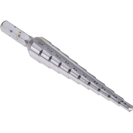 Precision HSS step drill bit for accurate drilling with non-slip hex shank.