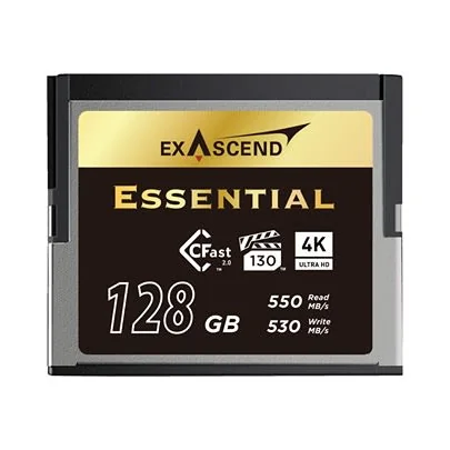 The Exascend CFast Card features 128GB capacity and 520MB/s read speed for efficient data storage.