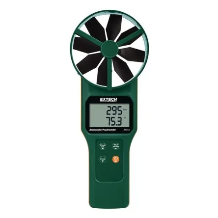 Measure air flow, temperature, and humidity with the Extech AN310 Vane Anemometer for precise environmental monitoring.