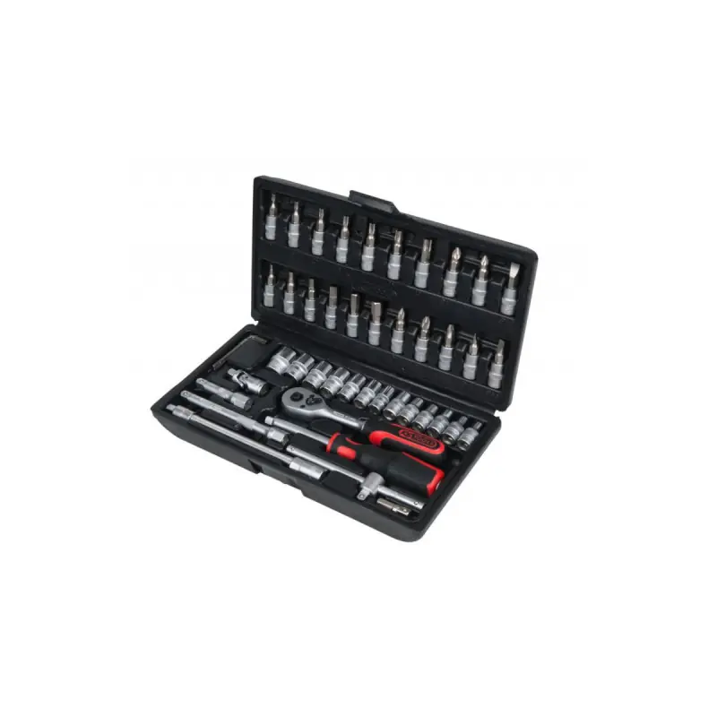 Discover the F6 KS TOOLS 1/4'' - CHROMEmat socket set, a complete set of 46 pieces designed to meet the needs of demanding DIYers. Made with high-quality materials, this socket set offers exceptional durability and wear resistance, ensuring increased longevity even in the most demanding working conditions. Each socket is carefully designed to fit perfectly on bolts and screws, allowing for optimal torque without the risk of deformation.