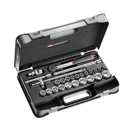 Professional Tools with Facom Tools Lifetime Warranty YTSCC-7274-2015-08 Where applicable ISO + DIN + ASME ratings apply to Facom Tools. Facom 1/2 in 26 Piece Socket Set. The Facom 26 piece 1/2 in Socket Set with Ratchet comes with a range of essential sockets. Designed to offer less wear, thanks to the torque being transmitted through the fastener flats instead of the corners. Also, the larger contact area between socket and fastener reduces stress but offers powerful tightening. Supplied in a robust storage case for protection and easy identification. Features and Benefits: 5° Recovery angle enables delicate work in confined spaces Ratchet handle has a high resistance to abrasion and solvents Made from chrome vanadium steel that delivers quality, strength and performance 72 Tooth mechanism Professional quality Chrome finish for easy cleaning Offers high torque without damage to fasteners Increased durability Typical Applications: This socket ; bits set is typically used by professional tradesmen, mechanics or those wishing to complete DIY. Socket sets can be used in many situations and professions where a socket is integral to carrying out a specific task revolving around loosening or tightening such as:- Maintenance Construction Home DIY Mechanics/Car garages FAQ's: Why choose this set? With its range of driver sockets, this kit is a compact and reliable asset to any toolkit either professional or DIY. With a ratchet style handle, you can work comfortably whether it ‘s tightening, loosening or just adjusting anything at home or on a job site. What do I get in the set? Sockets: 8, 9, 10, 11, 12, 13, 14, 15, 16, 17, 18, 19, 21, 22, 23, 24, 27, 28, 29, 30 ; 32 mm Reversible Ratchet 2 x Extensions Universal Joint Sliding Handle