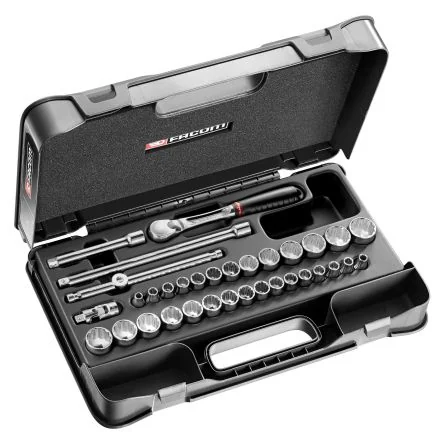This 34-piece socket set by Facom includes a ratchet and 12-point sockets, perfect for various applications.