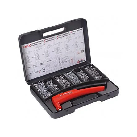 Comprising: - Y.104: riveter. - Selection of aluminium rivets with standard head 4 x 8 - 4 x 10 - 4.8 x 8 - 4.8 x 10 mm and with wide head 4 x 8 et 4 x 10 mm (approx. 600 rivets).