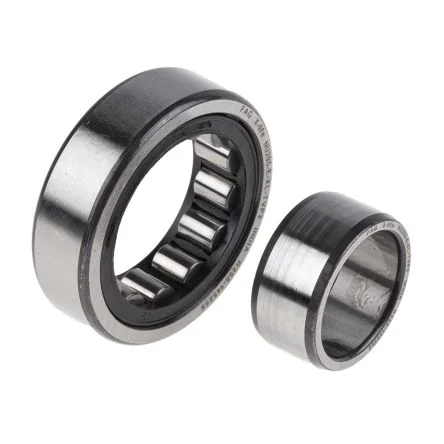 FAG Cylindrical Roller Bearing NU205-E-XL-TVP2The FAG 25mm ID, 52mm OD cylindrical roller bearing with a glass fibre reinforced polyamide cage and the removable inner ring is suitable for applications that support high radial loads and no axial loads. It has a C3 radial internal clearance designation to indicate that the radial slack between the inner and outer rings is greater than CN (normal) and the press fit inner and outer rings can withstand a large temperature differential. This clearance allows for thermal expansion as the bearing supports radial loads and its cylindrical rollers reduce rotational friction. This cylindrical roller bearing can support heavier loads than bearings with comparable-sized ball bearings because the cylindrical shape of the rollers provides more surface area for distributing the load and it has a larger roller set than the standard roller design. This cylindrical roller bearing can be used to a maximum operating temperature of 120°C(248°F). The inner and outer rings and cylindrical rollers are made from a low-alloy, through-hardened chromium steel for durability, heat tolerance and resistance to deformity under heavy loads. The bearing is non-locating, with two ribs on the interior circumference of the outer ring and no ribs on the exterior circumference of the inner ring. This is to allow the outer and inner rings to axially displace relative to each other from the central position. The glass fibre reinforced polyamide (PA66) cage prevents the rollers from coming into contact with each other during use to reduce friction, vibrations and noise. It weighs less and is quieter than brass cages. A removable inner ring in the open bearing allows for lubrication. This cylindrical bearing is used in a broad range of applications where high radial loads are present.Features and Benefits• Accommodates heavy radial loads, rapid accelerations and high-speed • Combines the high load carrying capacity of a full complement bearing with the high-speed capability of a bearing with cage • Low friction and allows high-speed applications • Can be easily mounted and dismounted • Enhanced operational reliability • Long service life • High stiffness
