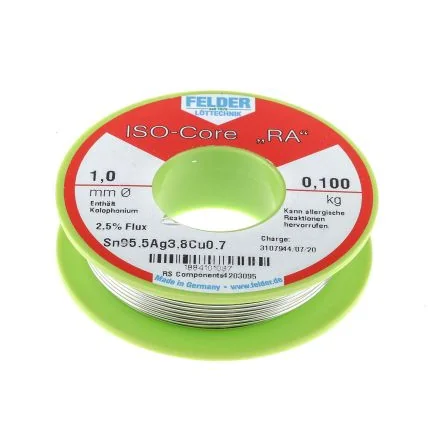 DIN EN 29454, EN 61190. ISO-Core® Lead-Free Solder Wire, EL, RA, ELR. Lead-free alloy solder wire Sn 95.5 Ag 3.8 Cu 0.7 on plastic coils Flux core based on modified resin and organic activators EL version with 3.5% flux, halogen-free, for general soldering RA activated with 2.5% halogen content for repairing even oxidised soldering spots ELR with 1% flux, halogen-free no clean, especially suited for SMD fittings Melting point 217 °C
