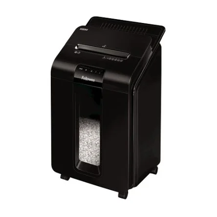 Effortlessly shred credit cards, paper clips, and staples with the Fellowes AutoMax 100M Mini Cut Shredder.