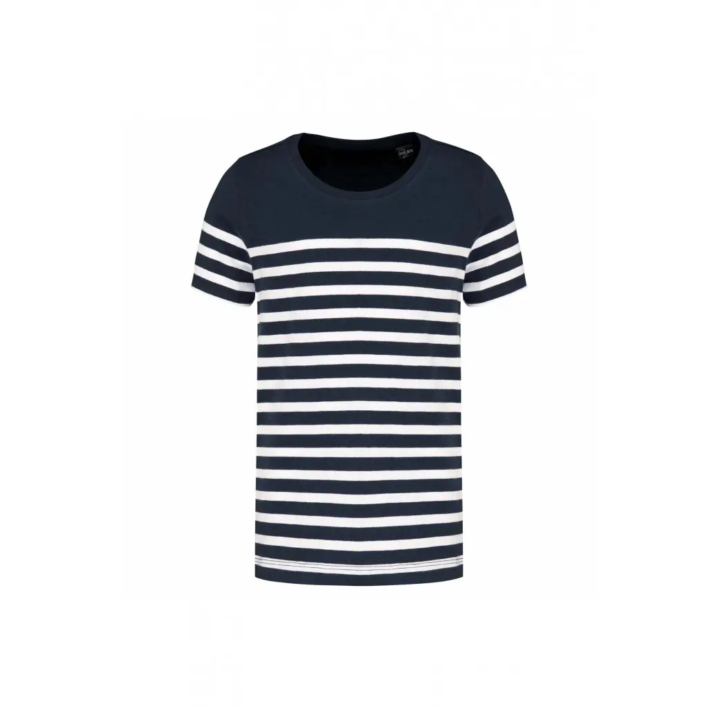 100% organic cotton. Straight cut. Enzyme wash. Round neck with 1x1 ribbing. Knitted stripes. Neck tape. Double needle finish at the sleeve hems and garment hem.