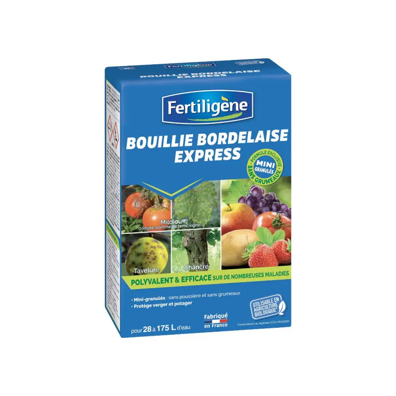 The FERTILIGENE Bordeaux mixture granules - 700g is a recognised anti-disease solution to combat numerous diseases that can affect your trees or your fruits and vegetables. Thanks to its granule formula, the application is straightforward as it simply requires mixing the appropriate dose in water.