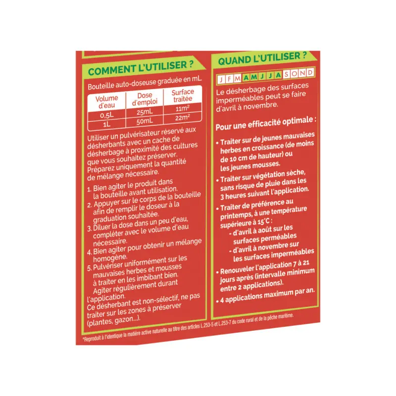 ThisFERTILIGÈNE concentrated weed killer - 800ml is a weed killer capable of eliminating up to 70 species of weeds on contact. This product is specially suited for your garden, your driveway, as well as paths and the surroundings of buildings. Weed at the base of shrubs or flower beds before creating or renewing a vegetable garden or lawn; you can sow or replant 1 day after application. The first results are visible in just 1 hour.