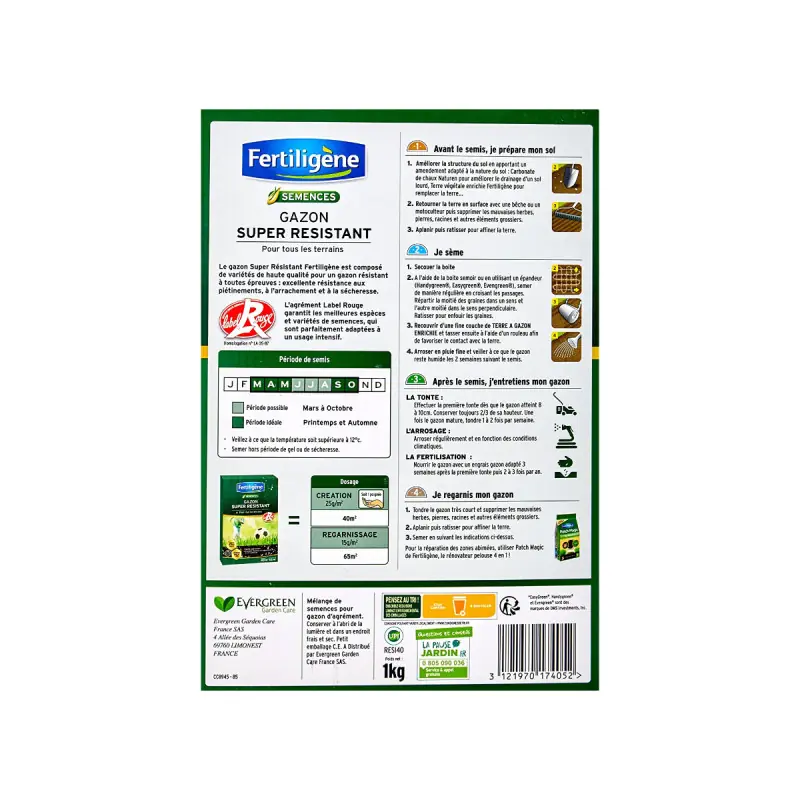 Keep your lawn immaculate with this FERTILIGÈNE pack which includes a 3.6kg magic lawn renovator patch and a super resistant lawn - Red Label - 40m² - 1kg. These two elements will allow you to repair, maintain, and revive your damaged lawn. Indeed, on one hand, the magic lawn renovator patch is a complete product thanks to its 4-in-1 formula. The mix of 3 seeds grows anywhere, in full sun, in the shade, or in trampled areas. The formula contains a quick-installation mix of 3 seeds: a fertiliser, a fixer, and a compressed plant support that works like a sponge and helps the seeds root firmly. Achieve a dense lawn in just 4 days: all you need to do is sow and water. On the other hand, the lawn is made up of high-quality varieties certified by the Red Label. They are suitable for intensive use and provide a lawn with excellent resistance to trampling, tearing, and drought. Germination occurs quickly in about 7 days.