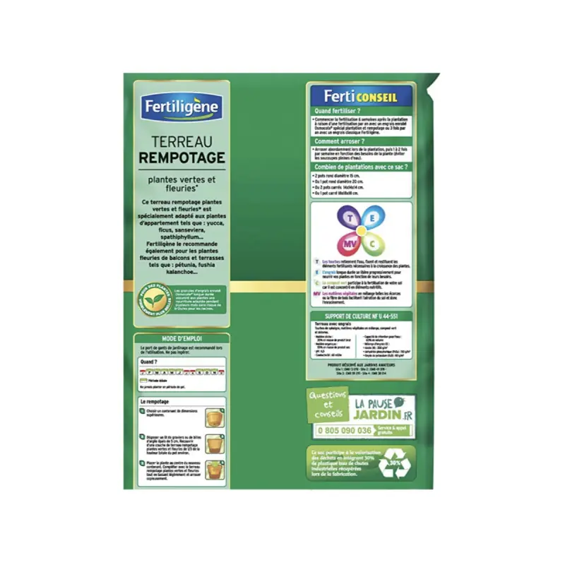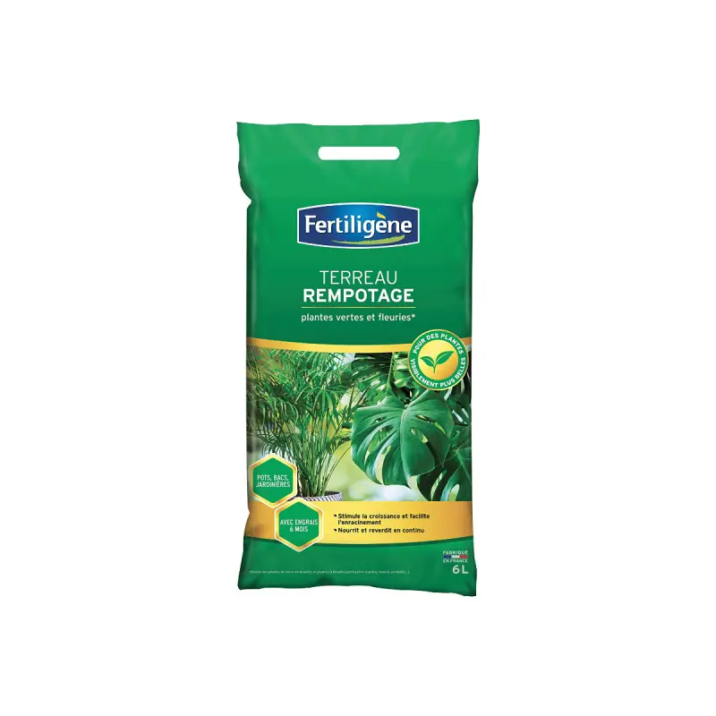 ThisFERTILIGÈNE Potting Soil for Green and Flowering Plants - 6L ready to use is designed for repotting and topping up houseplants (such as yucca, ficus, or spathiphyllum) or flowering balcony plants (such as petunias, fuchsias, or kalanchoe, for example). It is a product that allows for rapid rooting and will enhance your plants.