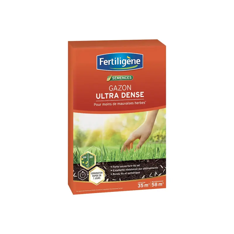 Thisultra-dense FERTILIGÈNE lawn - 35m² - 875g is made up of fast-germinating varieties to quickly achieve a dense lawn while reducing weeds. Germination occurs in 7 days, and the result is fine and aesthetic while having good resistance to trampling.