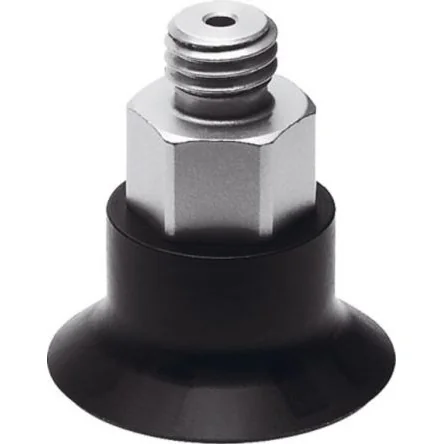 The Festo ESH suction cup holder with height compensator, vacuum connection at top and compensator secured by two hexagonal nuts. The threaded connection vaccum port for suction cup mounting M10.Voulme = 3.327Cm3 Assembly position = vertical Correlation to suction-cup holder = size 5