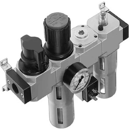 The Festo service unit FRC-3/8-D-MIDI-KC consisting of manual on/off valve, filter regulator, distributor module with pressure switch but without socket, and lubricator with mounting brackets. It has manual condensate drain and metal bowl guard.Size Maxi Series D Actuator lock Rotary knob with lock Assembly position Vertical +/- 5° Grade of filtration 40 µm