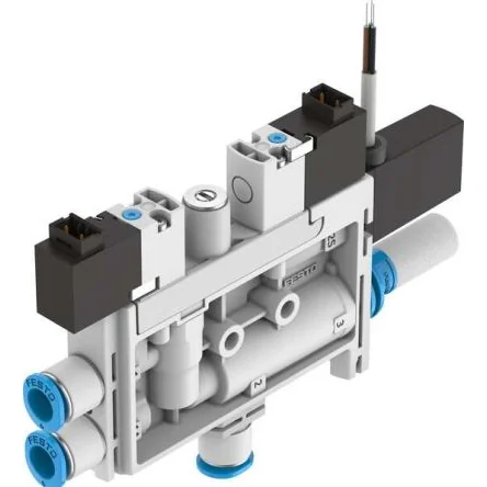 The Festo OVEL series T-shaped vacuum generator with nominal nozzle size of 0.95mm. This supports piezoresistive pressure sensor measurement method with 2-digit display. It has operating pressure ranges between 2 bar and 7 bar.Grid dimension - 15 mm Open silencer design High vacuum eject characteristic