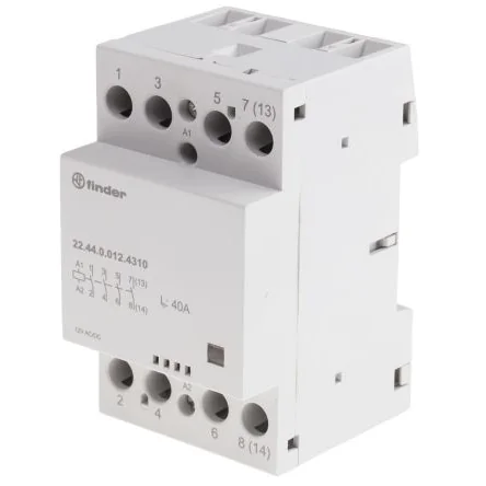 22.44 ; 22.64 Series - Modular contactors. Finder 22 series 4-pole modular contactors, rail mounted, with 4 pole. 40 - 63 A Continuously duty for the coil and contacts AC/DC silent coil with varistor protection Protective separation (reinforced insulation) between coil and contacts Compliant with EN 61095:2009 and with EN 60947-4-1:2009 35 mm rail mount Screw terminal Auxiliary modules available for 22.44 and 22.64 series (800-2916 and 800-2925)