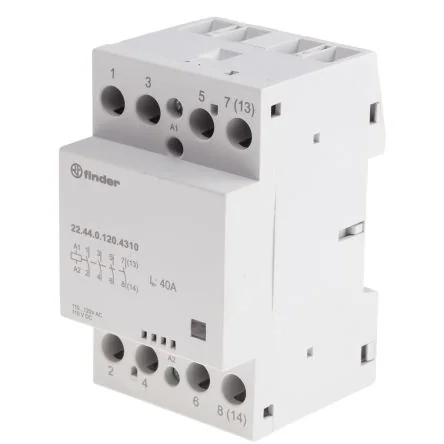 22.44 ; 22.64 Series - Modular contactors. Finder 22 series 4-pole modular contactors, rail mounted, with 4 pole. 40 - 63 A Continuously duty for the coil and contacts AC/DC silent coil with varistor protection Protective separation (reinforced insulation) between coil and contacts Compliant with EN 61095:2009 and with EN 60947-4-1:2009 35 mm rail mount Screw terminal Auxiliary modules available for 22.44 and 22.64 series (800-2916 and 800-2925)
