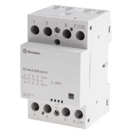 22.44 ; 22.64 Series - Modular contactors. Finder 22 series 4-pole modular contactors, rail mounted, with 4 pole. 40 - 63 A Continuously duty for the coil and contacts AC/DC silent coil with varistor protection Protective separation (reinforced insulation) between coil and contacts Compliant with EN 61095:2009 and with EN 60947-4-1:2009 35 mm rail mount Screw terminal Auxiliary modules available for 22.44 and 22.64 series (800-2916 and 800-2925)