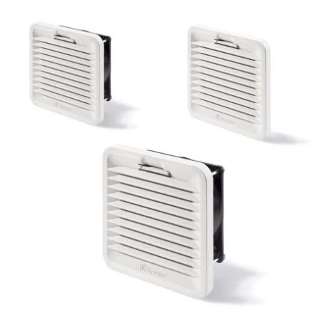 Filter Fan for electrical cabinets and enclosures 120 V or 230 V AC versions.Very low acoustic noise Minimal depth within enclosure Air volume (14…470) m³/h (with Exhaust Filter installed in cabinet) Air volume (24..630) m³/h (free flow) Operating voltage: 24 VDC, 120 V AC, 230 V AC Air conditioners Automatic car-washes Carousel warehouses Control panels