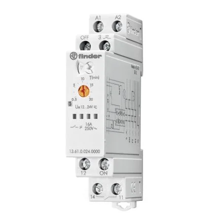 13.61 Series - Multifunction Step/Monostable Relays with Reset Command. Finder 13.61 Series multifunction step/monostable relay with reset command, rail mounted with 1 pole. Multifunction (Step, Timing step, Monostable, Light ON) Reset feature, for centralised off command Control input can be continuously applied Longer mechanical and electrical life, and quieter than electromechanical step relays Zero-crossing load switching 35 mm rail mount Cadmium free contact material Screw terminal