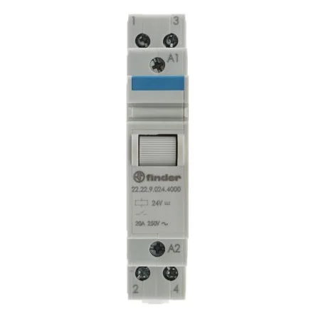 Finder Monostable Din RelayThe Finder 22 series DIN rail mount non-latching relay has contact configuration of DPNO. It is actuated with a 24VDC coil and 20A switching current. This relay is equipped with 20A, 250VAC Cadmium-free contacts rated at 5000VAC1. The relay has a nominal lamp load rating of 1000W for incandescent and 360W for compensated fluorescent.Features and Benefits17.4 mm wide 35 mm rail mount Coil power is 1.25W Coil resistance is 460ohm Identification label Insulation between coil and contacts(1.2/50µ) is 4KV Manual test button Mechanical life 500 x103 cycles Operating temperature ranging between -40°C and 40°C Screw terminal typeApplicationsAir conditioning Heating LightingCertificationsCE certified GOST IP20 rated EN 60715