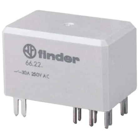 DPST-NO versions IMQ; cULus DPDT versions CSA, IMQ, RINA, cULus; VDE. For flange mount versions with 0.25 inch Faston style terminals see the 66.82 series, stock number ; 749-5152 749-5152 typically. 66 Series - 66.22. Finder's 66 series of PCB power relays are designed to suit photovoltaic (PV) inverters, domestic appliances and other equipment needing reinforced insulation, high ambient temperature and full disconnection contacts. The 66 series of PCB power relays are rated up to 30A and available in DPST-NO or DPDT formats with AC or DC coils. The DPST-NO versions (stock numbers ; 749-5133 749-5133 , ; 749-5137 749-5137 , ; 749-5146 749-5146 , ; 749-5143 749-5143 and ; 749-5149 749-5149 ) have a contact gap separation of 1.5mm, fully meeting the requirements of the VDE 0126-1-1 standard for photovoltaic (PV) inverter applications. In addition, stock number ; 749-5143 749-5143 features a 5mm air gap (stand-off) between relay base and PCB for extra cooling, ideal in systems where forced air cooling is employed as with many photovoltaic (PV) inverters. All of Finder's 66 series PCB power relays have been designed with an 8mm clearance and creepage distance, ensuring safe separation of supply and output, and reinforced insulation between coil and contacts, meeting the requirements of EN60335-1 (VDE 0700). Suitable for heavy duty load switching Contact gap =1.5mm according to VDE 0126-1-1 for solar inverter applications (DPST-NO versions only) Reinforced insulation between coil and contacts according to EN60335-1 (VDE 0700), with safe separation and 8mm clearance and creepage distance 6kV (1.2/50 µs) isolation, coil to contact Dielectric strength 4000Vac, coil to contact Flux proof construction