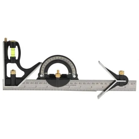 Versatile 12 in combination square set with steel rule and protractor for accurate measurements.