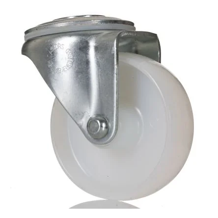 Nylon Wheeled Castor, Single Bolt Hole Mounting. Zinc plated, gold passivated body Solid Nylon Wheel