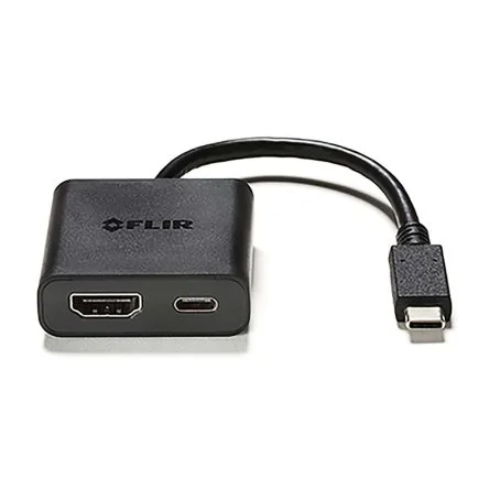 The FLIR adapter is used to connect the infrared camera to a HDMI monitor. Requires a standard HDMI cable (not supplied by FLIR). The adapter can also be connected to a power source (Power Delivery).Weight 30 g (1.1 oz.) Connector USB Type-C male to HDMI female