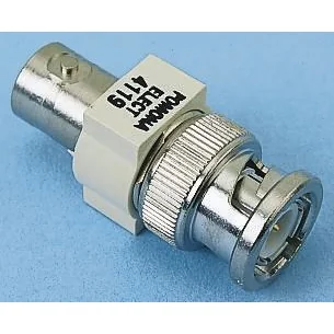 Resistor attenuators. BNC male and female resistor attenuators with a through resistance of 50 or 75 O to limit signal distortion.