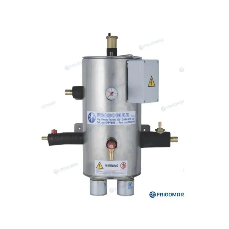 Stainless steel boiler with shielded electric heaters to heat the water in a closed circuit of fan coil when it is not possible to use the heat pump. Available with single-phase and three-phase power supply and stepper drive.