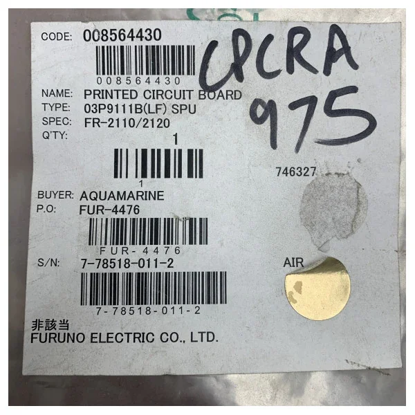 Upgrade or replace your existing SPU board with this original Furuno part. The Furuno X-Band Radar SPU Board, model number 03P9111B(LF), is a crucial component for the reliable operation of your Furuno FR-2110 and FR-2120 radar instruments. This board, with part number 008-564-430, ensures correct signal processing and communication within your radar system, allowing you to always rely on an accurate representation of the environment.