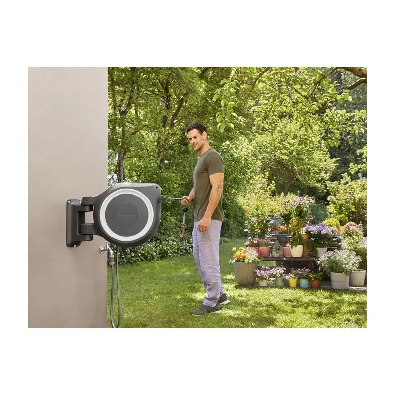 Wall-mounted automatic hose reel ideal for watering large gardens. It is a very practical watering and cleaning solution to keep your hose always ready for use and neatly stored.