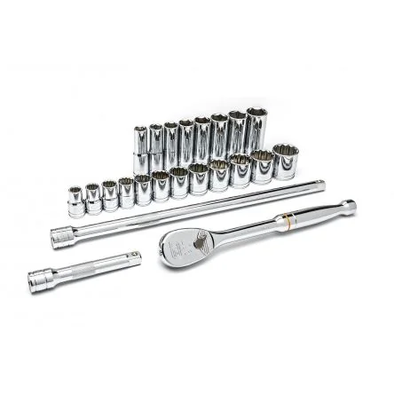 This 23-piece socket set features deep and standard sockets for versatile use, perfect for any automotive project.