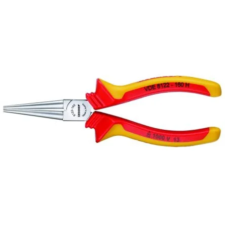 EN60900, IEC600900 2004. VDE Round Nose Insulated Pliers. 1000V insulated round nose pliers with long jaws ideal for gripping and bending. Serrated jaws for firm grip Manufactured from hardened ; tempered steel Chrome plated finish VDE insulated handles with comfortable grip