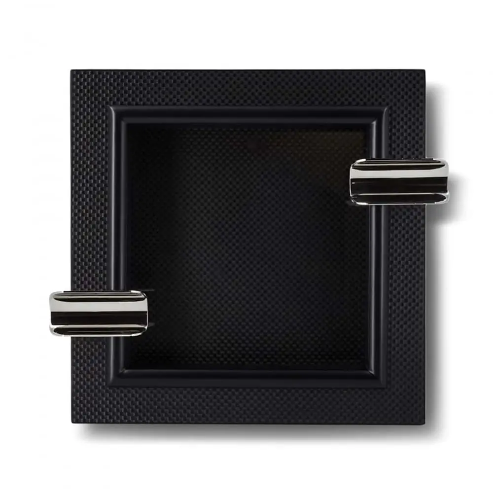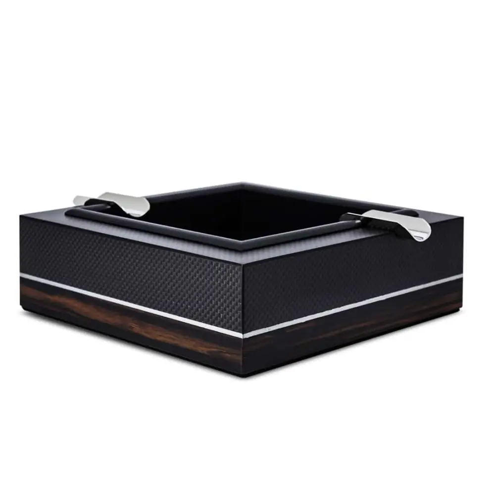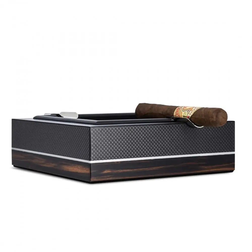 magnificent cigar ashtray luxury accessory for all aficionados. in ebony and carbon with two cigar rests on top.