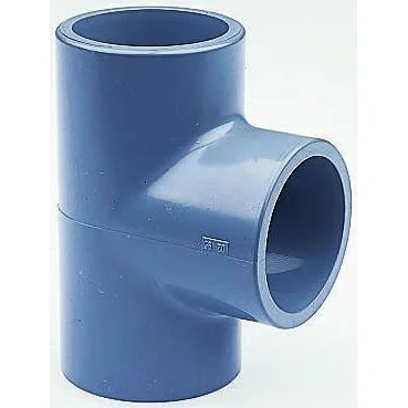 ISO/TR 7473; ISO/TR 7474; ISO/TR 7471; ISO TR 10358; DVS 2205 Part I. Water Bylaws Scheme. Tee 90°. High quality PVC-U fittings, valves, pipe work and accessories for a wide range of exterior and interior applications. PVC has excellent chemical resistance which combined with smoothness of bore eliminates build up of scale and gives good flow characteristics. Being odourless and tasteless it is suitable for conveying drinking water and many food products. Jointing is by solvent weld cement Typical applications include: potable water supply and distribution, industrial process water systems, food chemical, pharmaceutical, medical, electronic production, brewing, beverage, water treatment industries, and irrigation applications Chemical Resistance: The chemical resistance properties of PVC-U are excellent; it is resistant to most solutions of acids, alkalis and salts and to solvents that can be mixed with water. PVC-U is not resistant to aromatic and chlorinated hydrocarbons Material: Tin stabilised compound conforming to the EEC safety levels for vinyl chloride monomer (VCM) and the WRAS requirements for use with potable water WRAS (WRc): Approved product for potable water